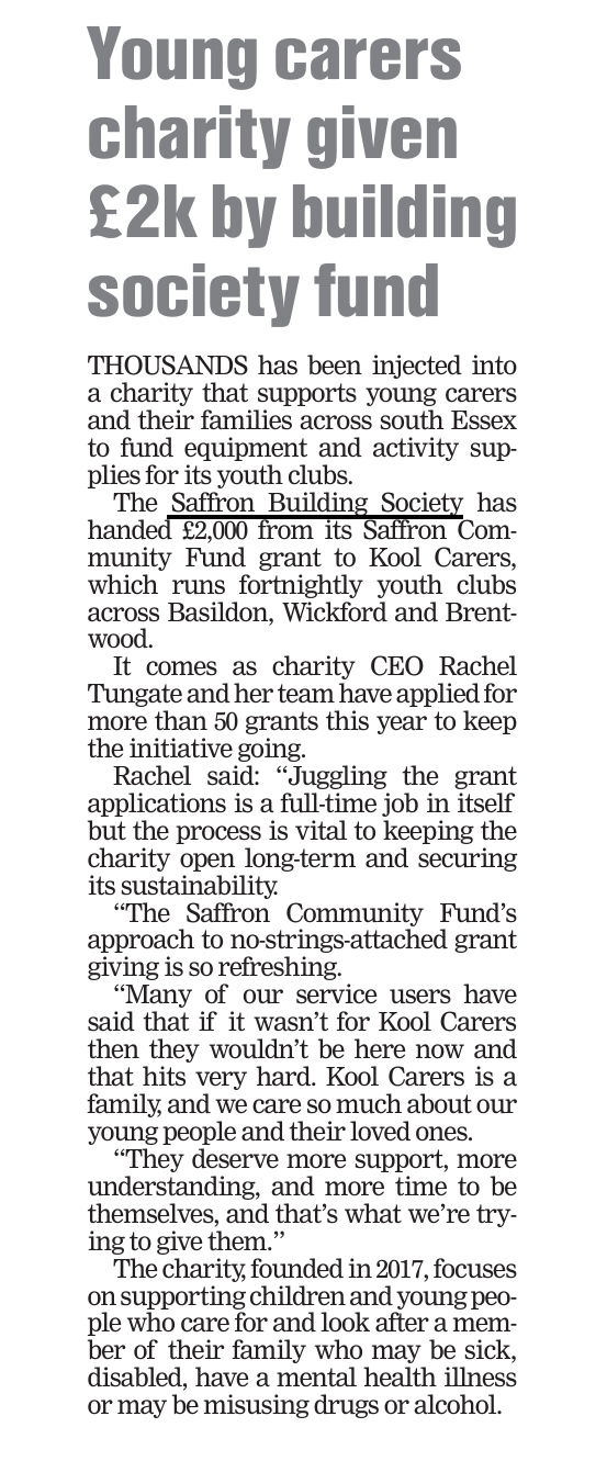 Thank you Saffron Building Society 8th December 2023 Previous Kool Carers Charity Shop!!! Newer ANNUAL GENERAL MEETING Leave a Reply Cancel replyYour email address will not be published. Required fields are marked *Name * Email * Website Comment Notify me of follow-up comments by email. Notify me of new posts by email. Δ